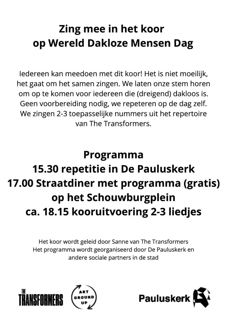 Zing mee in ons Open Choir: leer in 1 koorrepetitie 2 nummers die we dezelfde middag uitvoeren op het Schouwburgplein tijdens het programma rondom Wereld Dakloze Mensen Dag, georganiseerd door de Pauluskerk en andere sociale partners.